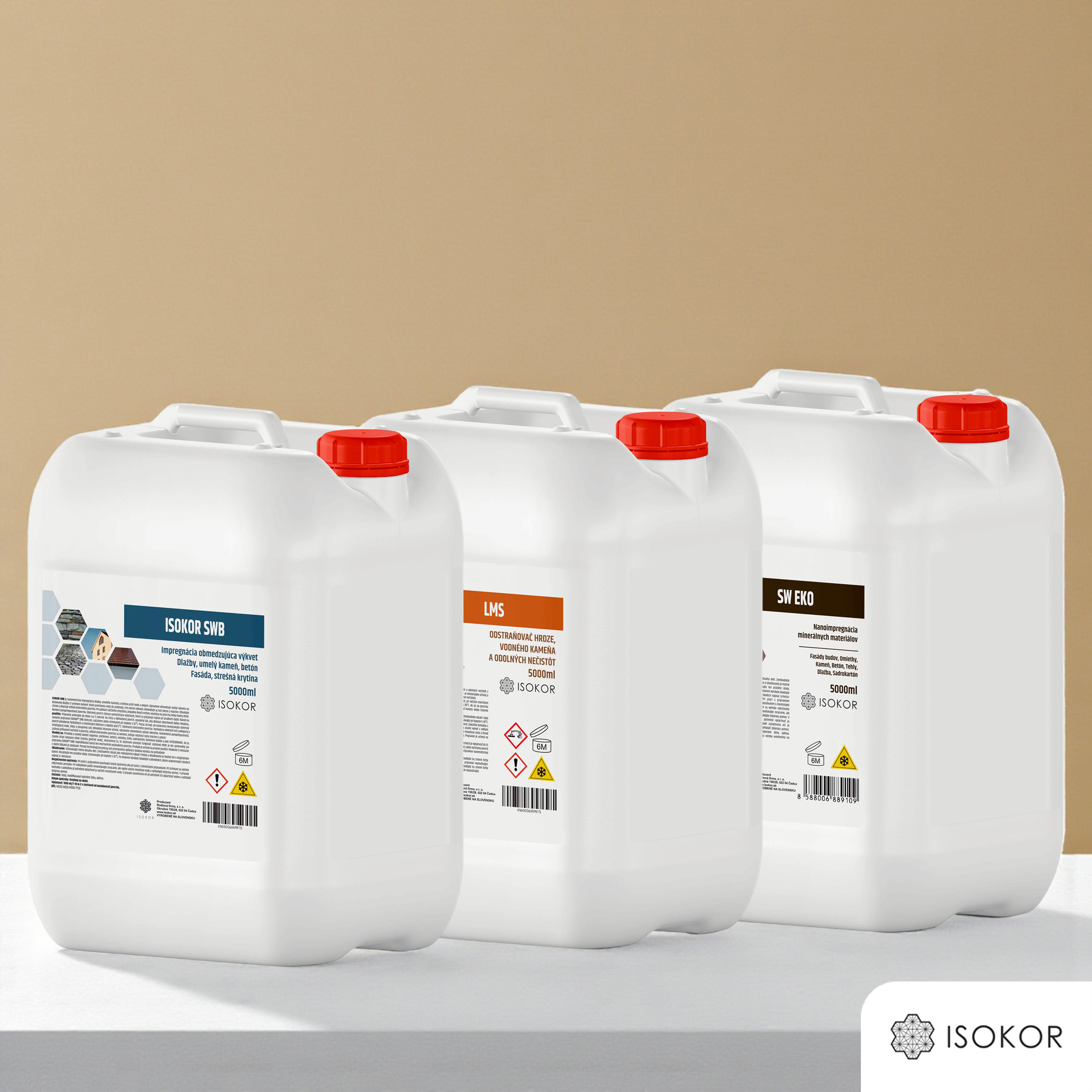 - Ochrana okolia: Pred aplikáciou prípravkov Isokor LMS a Isokor SW EKO zakryte všetky povrchy, ktoré nechcete ošetriť, ako sú okná, dvere, záhradné rastliny alebo kovové prvky, ktoré by mohli prísť do kontaktu s produktmi.